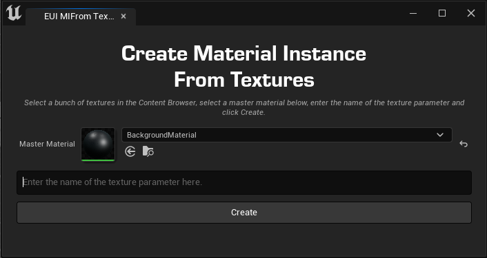 The tool was made to speed up the process of creating many material instances from many textures. It was a very specific use case for an unannounced project. I developed it using the Unreal Engine 5 editor utility widget. It creates new material instances and assigns the selected textures to the specified parameter of the instance.